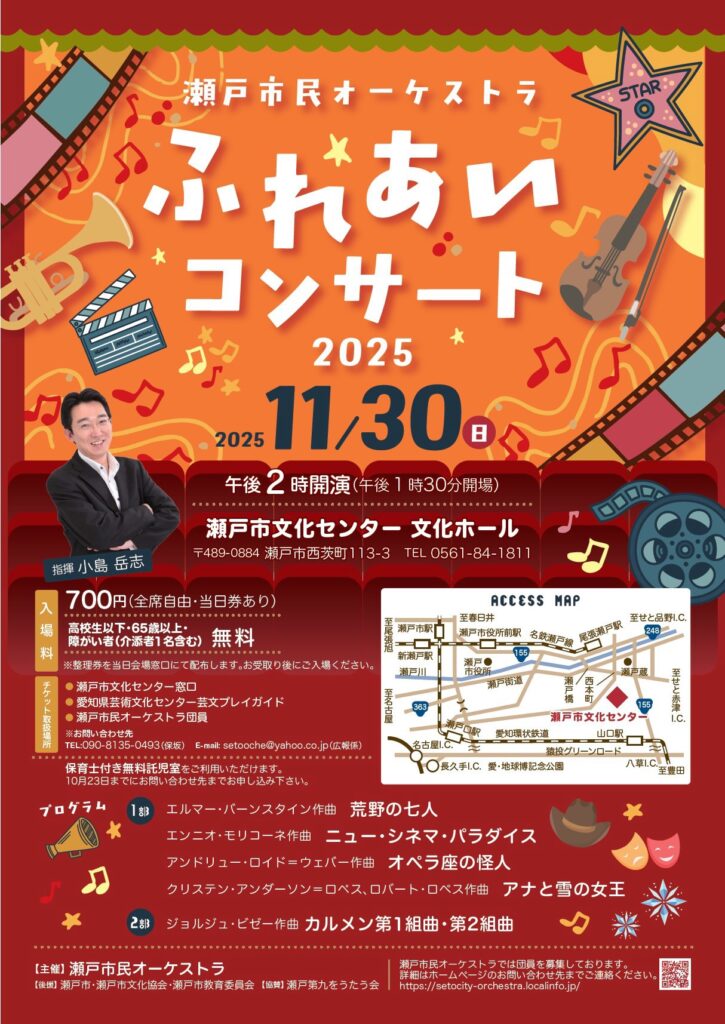 SNS: YouTube Instagram Instagram Facebook X HOME > イベント情報 > イベント情報 11/30(日)瀬戸市民オーケストラ 投稿日:2025年11月10日 瀬戸市文化センター 文化ホール 午後2時開演(午後1時30分開場) ふれあいコンサート 700円 指揮 小島岳志 Twitter Share Google+ Pocket B!Hatena LINE -イベント情報